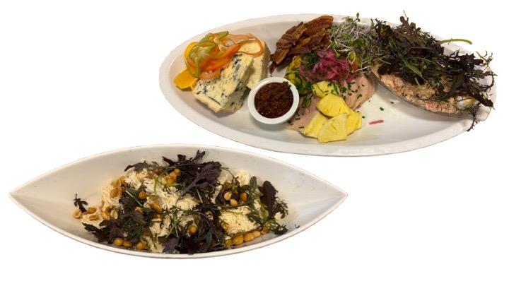 Arbejdsfrokost anrettet på fade med seks kolde og en lun ret, Arbejdsfrokost bliver leveret med tallerkener, bestik og serviette